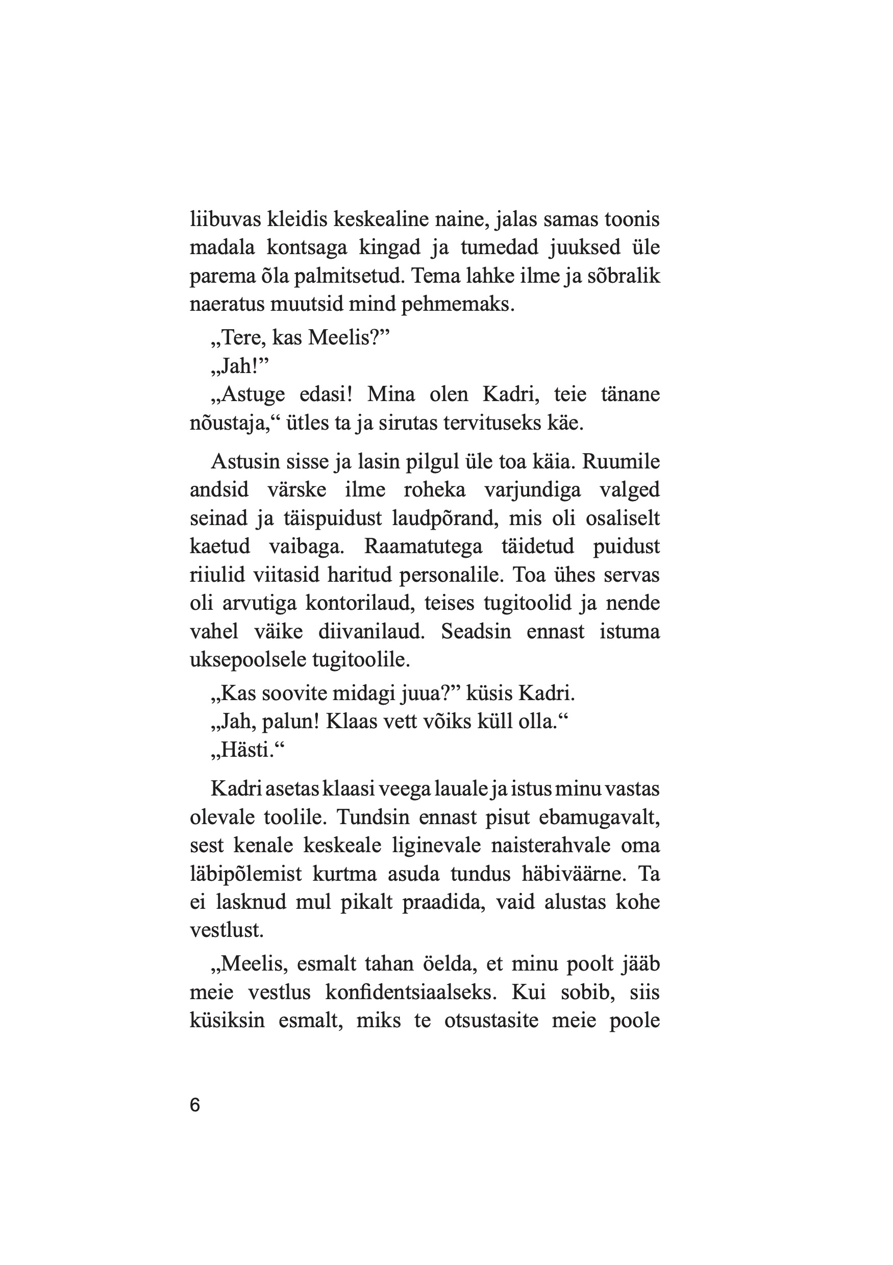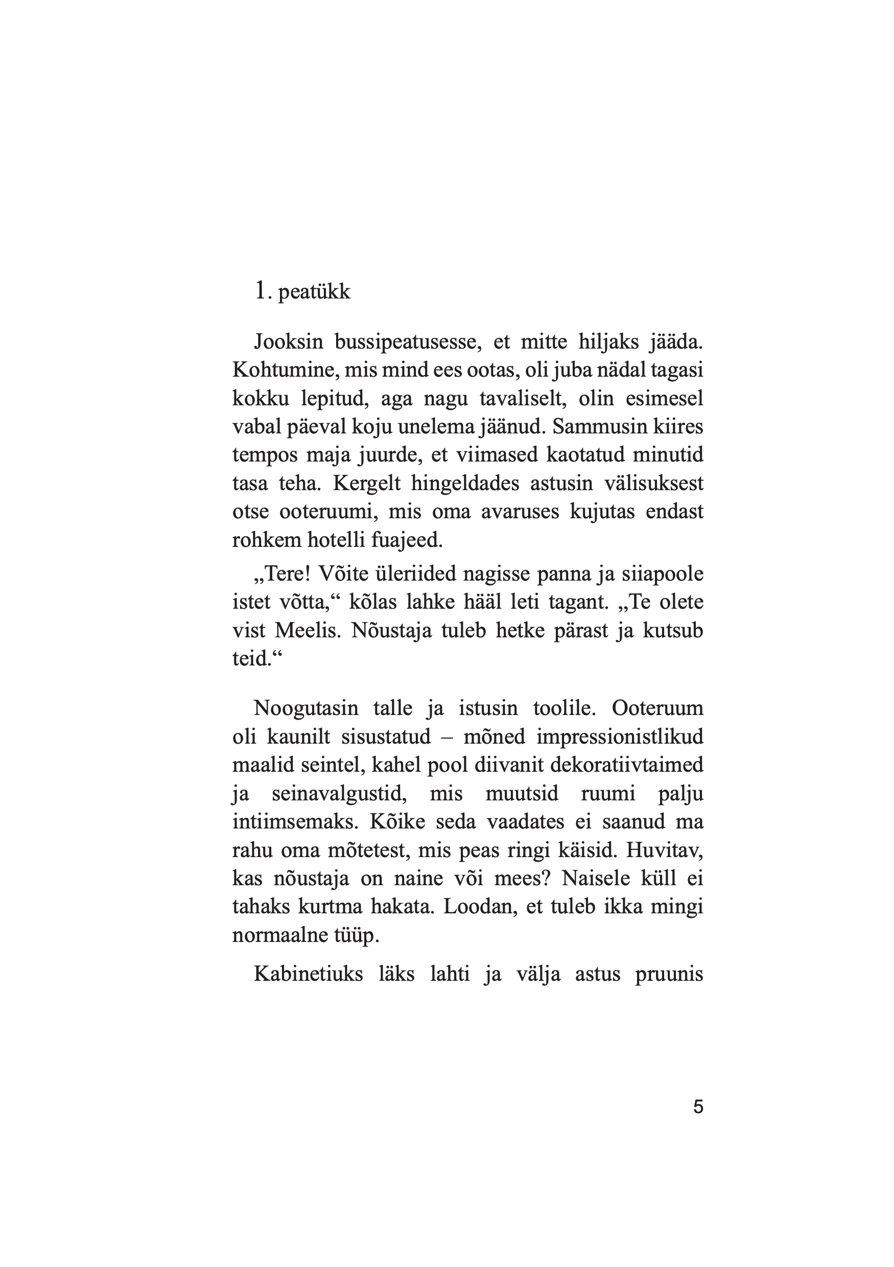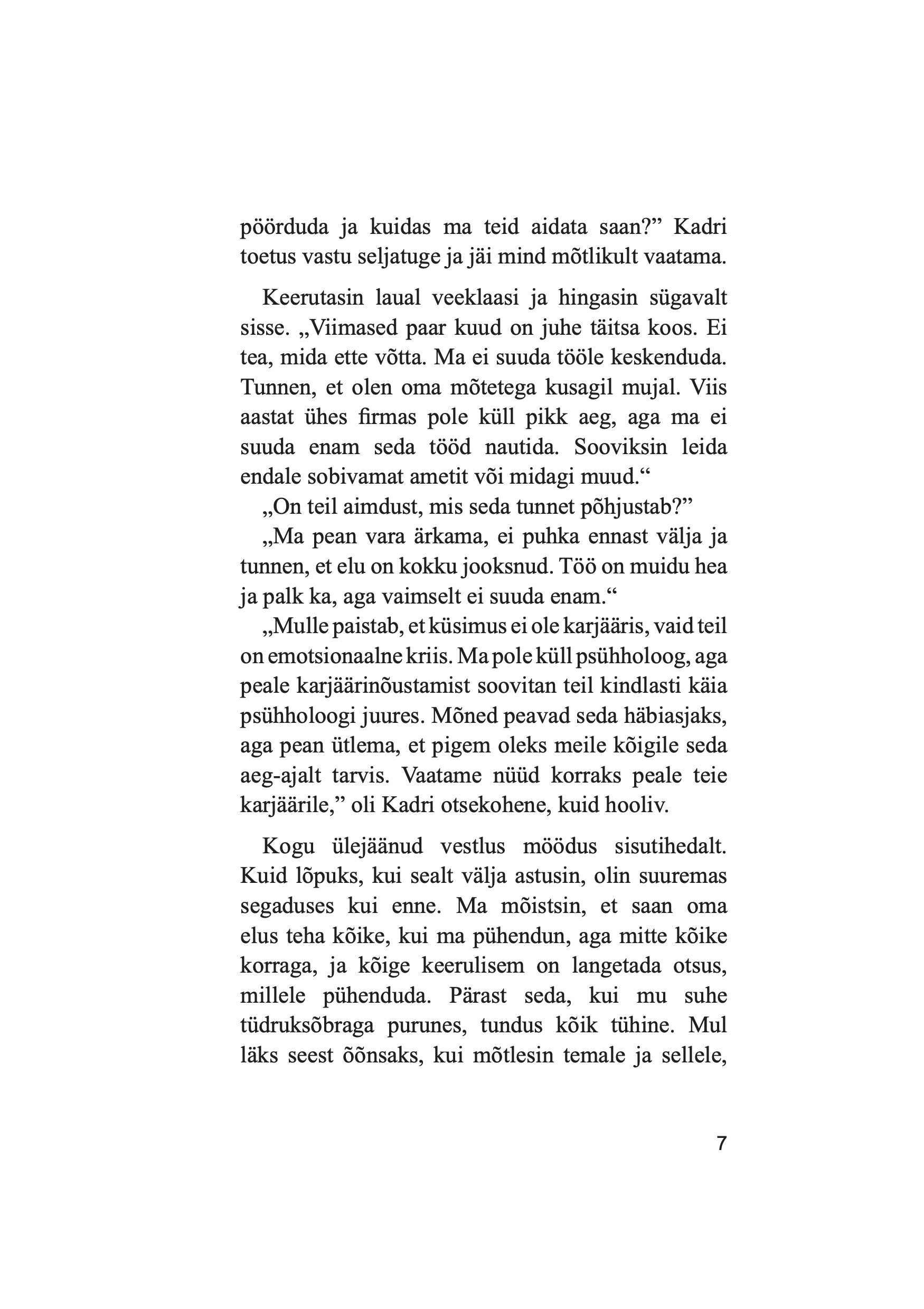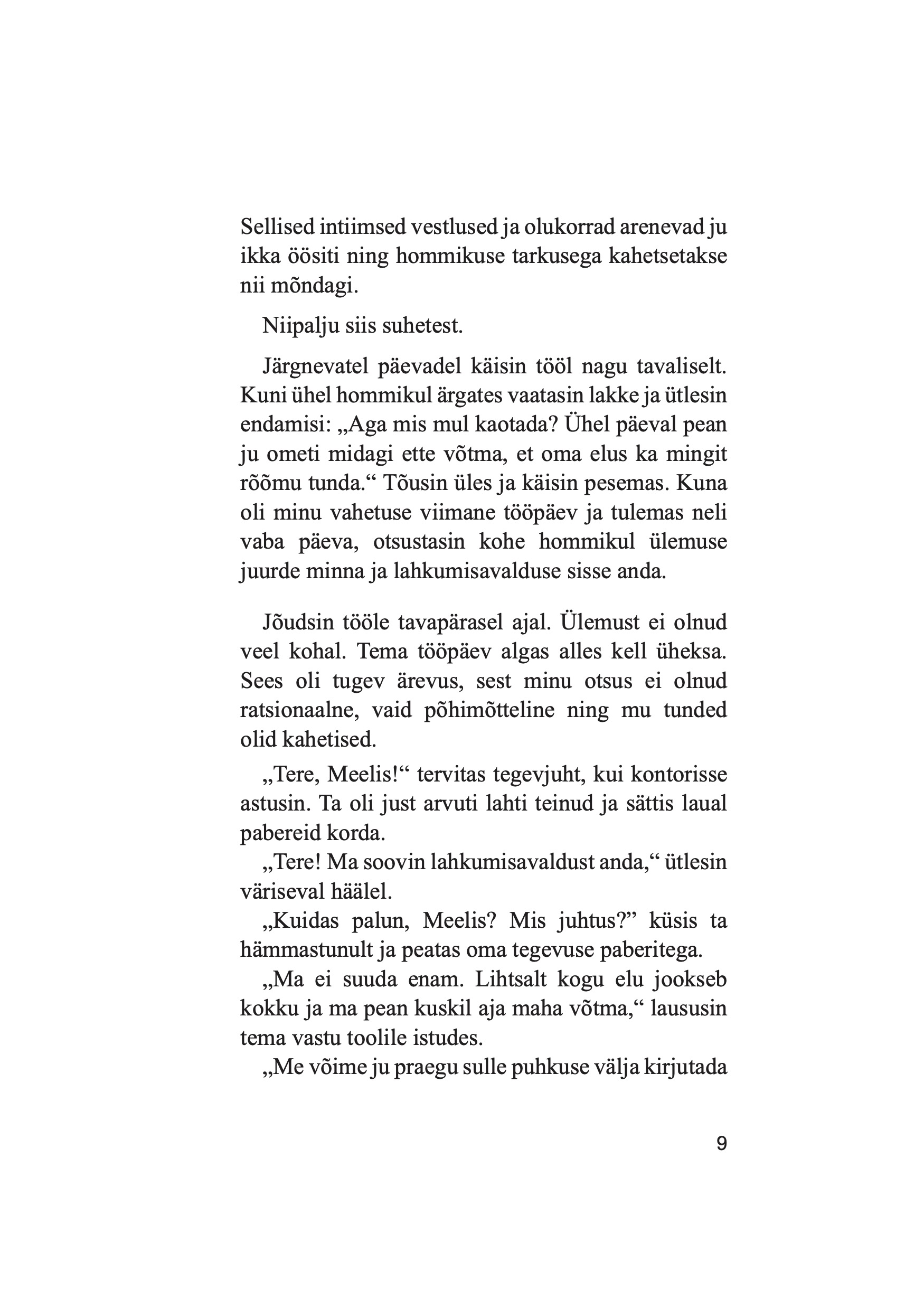 Raamat viib lugeja Meelise elukeerisesse, kus ootavad ees eneseavastused, katsumused, ootamatud kohtumised ja palju muud. Kas ta leiab uuel maal oma elule tähenduse või sunnib saatus teda tagasi pöörduma, kahetsedes, et üldse lahkus?